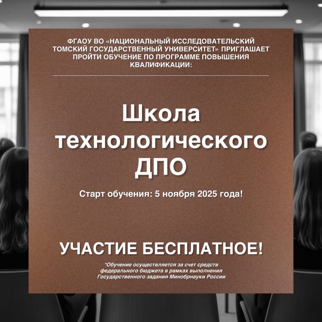ФГАОУ ВО «Национальный исследовательский Томский государственный университет» приглашает пройти обучение* по программе повышения квалификации «Школа технологического ДПО». Программа направлена на подготовку проектных